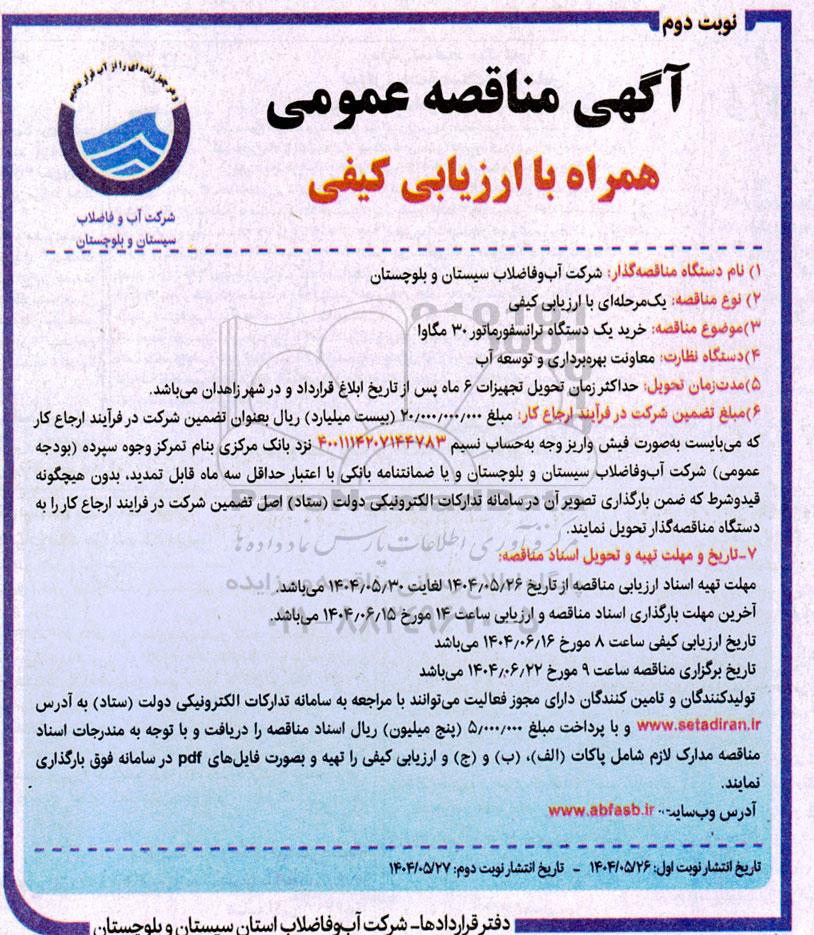 مناقصه همراه با ارزیابی کیفی خرید یک دستگاه ترانسفورماتور 30 مگاوا - نوبت دوم از کلیه افراد متخصص و شرکتها واجد شرایط دعوت به عمل میآید در مناقصه با کد خبرگزاری پارس نماد: 9422801 شرکت نمایند.