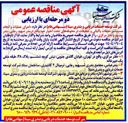 شرکت توسعه خدمات دریایی و بندری سینا (سهامی عام) در نظر دارد اجرای عملیات و انجام مستمر خدمات پاکبانی و تنظیفات در محوطه های تحت اختیار خود واقع در بندر شهیدرجایی، بندر بوشهر و دفتر مرکزی را از طریق مناقصه عمومی به متقاضیان واجد شرایط واگذار نماید. لذا از داوطلبان شرکت در مناقصه عمومی دعوت می شود از تاریخ درج آگهی لغایت پایان وقت اداری روز سه شنبه به تاریخ 1404.6.4 جهت دریافت اسناد و شرایط مناقصه (ارائه آدرس Email در معرفی نامه دریافت اسناد مناقصه الزامی است و کلیه اصلاحیه های مناقصه به آدرس ایمیل ارائه شده، ارسال می گردد) به آدرس های ذیل مراجعه فرمایند.