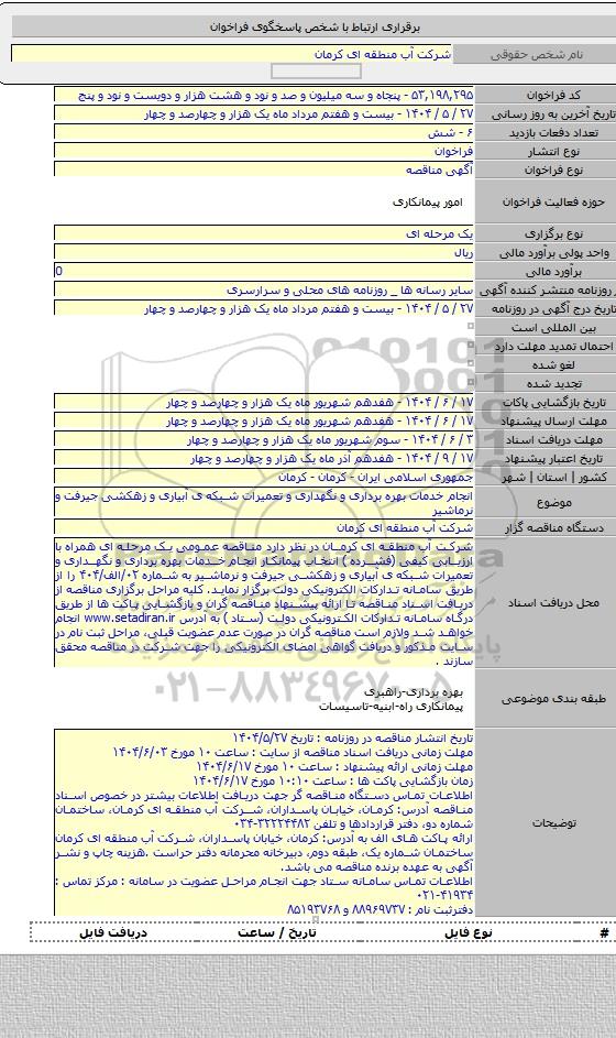 شرکت آب منطقه ای کرمان در نظر دارد مناقصه عمومی یک مرحله ای همراه با ارزیابی کیفی (فشرده ) انتخاب پیمانکار انجام خدمات بهره برداری و نگهداری و تعمیرات شبکه ی آبیاری و زهکشی جیرفت و نرماشیر به شماره ۰۲/الف/۴۰۴ را از طریق سامانه تدارکات الکترونیکی دولت برگزار نماید. کلیه مراحل برگزاری مناقصه از دریافت اسناد مناقصه تا ارائه پیشنهاد مناقصه گران و بازگشایی پاکت ها از طریق درگاه سامانه تدارکات الکترونیکی دولت (ستاد ) به آدرس www.setadiran.ir انجام خواهد شد ولازم است مناقصه گران در صورت عدم عضویت قبلی، مراحل ثبت نام در سایت مذکور و دریافت گواهی امضای الکترونیکی را جهت شرکت در مناقصه محقق سازند .