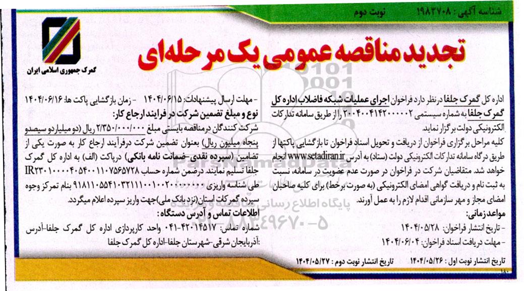 اداره کل گمرک جلفا در نظر دارد فراخوان اجرای عملیات شبکه فاضلاب اداره کل گمرک جلفا به شماره سیستمی 2004004142000002 را از طریق سامانه تدارکات الکترونیکی دولت برگزار نماید.