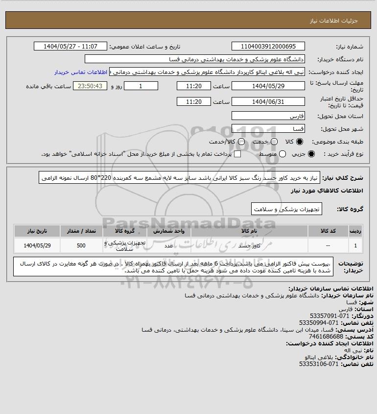 | 1 | -- | کاور جسد | عدد | تجهیزات پزشکی و سلامت | 500 | 1404/05/29 |