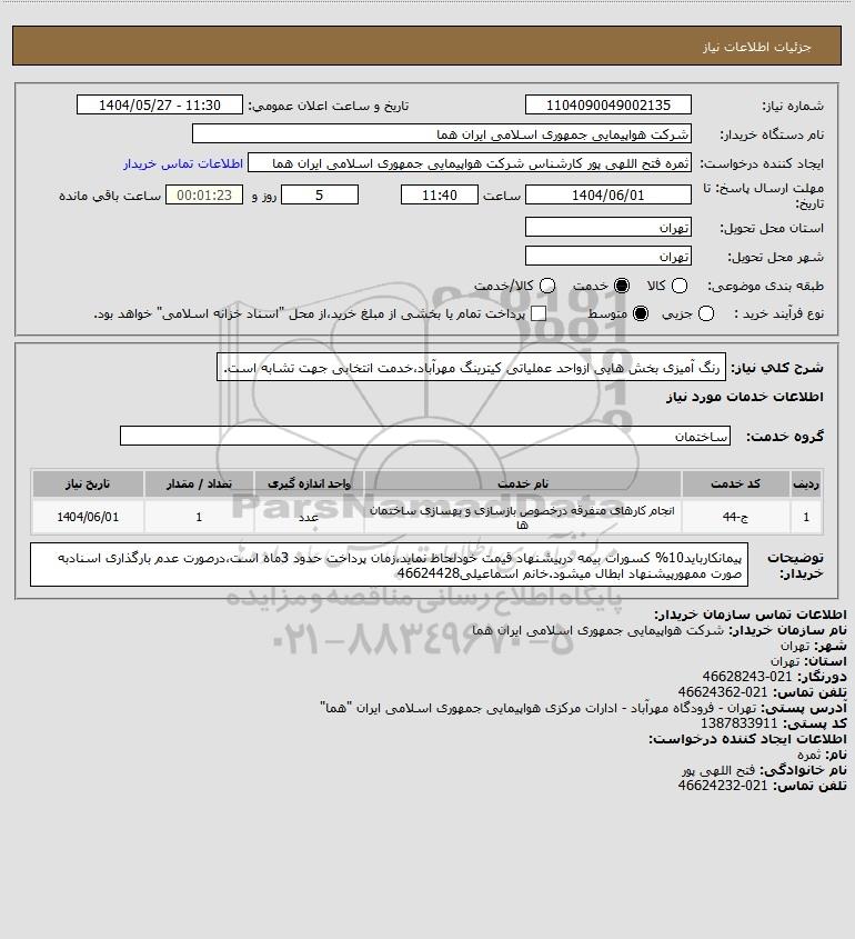 شرح کلی نیاز: رنگ آمیزی بخش هایی ازواحد عملیاتی کیترینگ مهرآباد،خدمت انتخابی جهت تشابه است.