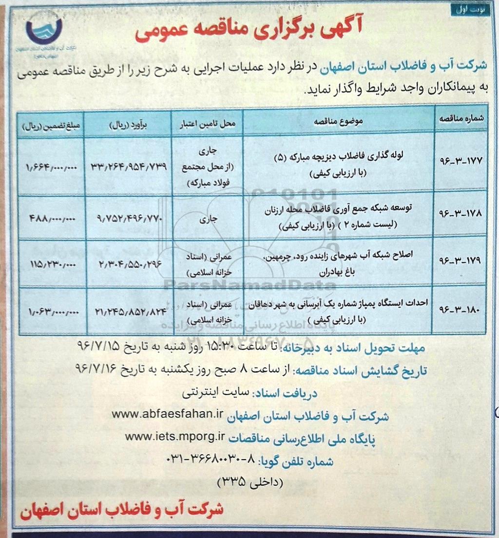 شرکت آب و فاضلاب استان اصفهان در نظر دارد عملیات اجرایی به شرح زیر را از طریق مناقصه عمومی به پیمانکاران واجد شرایط واگذار نماید.