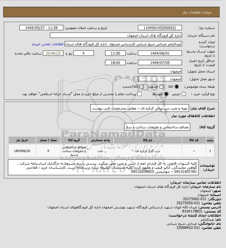 | 1 | -- | درب گاراژ کرکره ای | عدد | مصالح ساختمانی و ملزومات ساخت و ساز | 4 | 1404/06/10 |