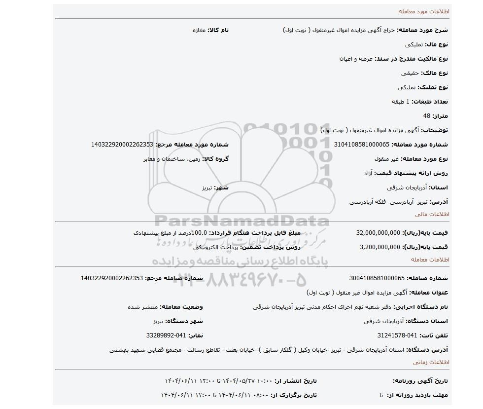 | نام دستگاه اجرایی: دفتر شعبه نهم اجرای احکام مدنی تبریز آذربایجان شرقی | وضعیت معامله: منتشر شده | |