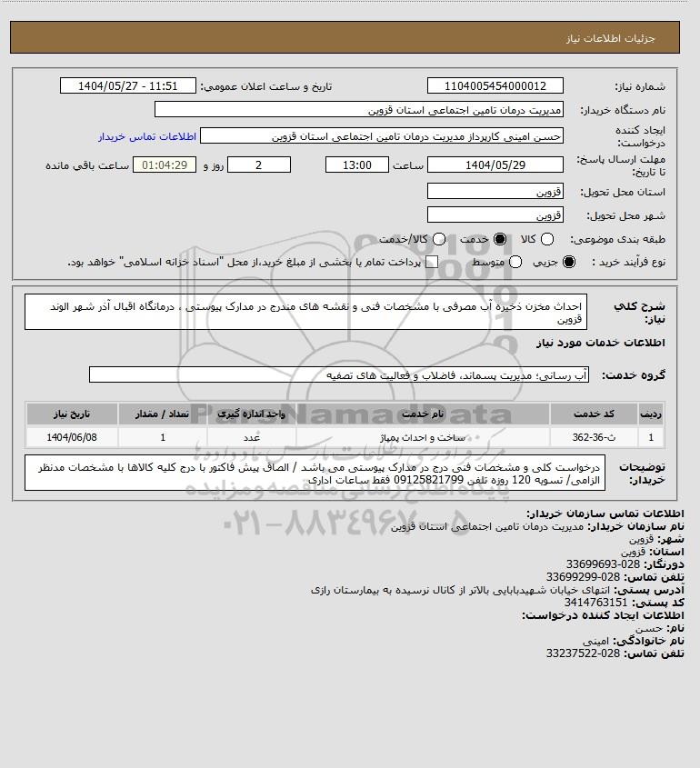 شرح کلی نیاز: احداث مخزن ذخیره آب مصرفی با مشخصات فنی و نقشه های مندرج در مدارک پیوستی ، درمانگاه اقبال آذر شهر الوند قزوین