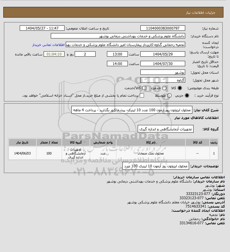 شرح کلی نیاز: محلول ایزوتون روز آزمون 100 عدد 10 لیتری- پیشفاکتور بگذارید - پرداخت 4 ماهه