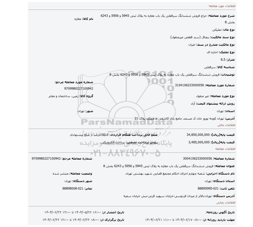 | شرح مورد معامله: حراج فروش ششدانگ سرقفلی یک باب مغازه به پلاک ثبتی 5945 و 5956 و 6243 بخش 8 | نام کالا: مغازه | |