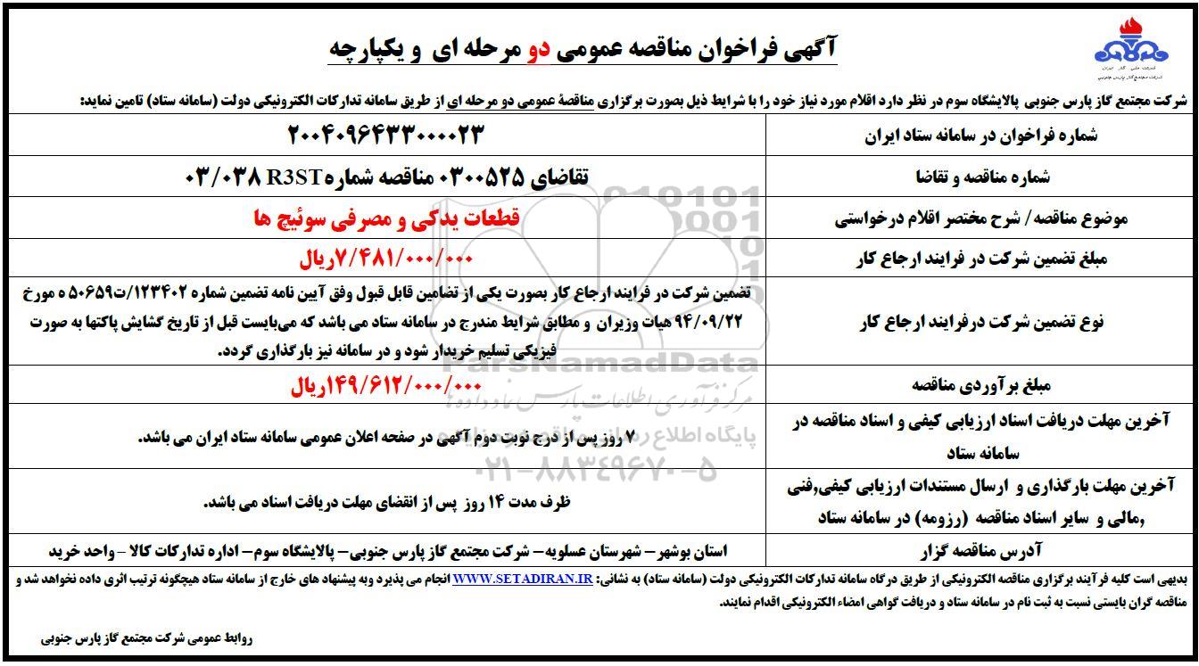 شرکت مجتمع گاز پارس جنوبی پالایشگاه سوم در نظر دارد اقلام مورد نیاز خود را با شرایط ذیل بصورت برگزاری مناقصه عمومی دو مرحله ای ریالی از طریق سامانه تدارکات الکترونیکی دولت (سامانه ستاد) تامین نماید: