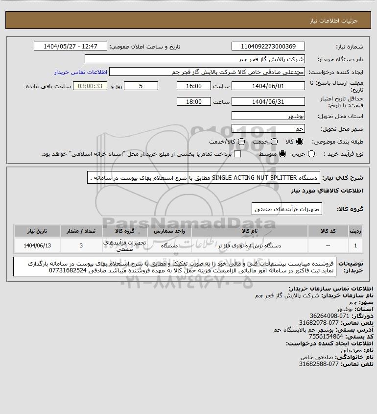شرح کلی نیاز: دستگاه SINGLE ACTING NUT SPLITTER مطابق با شرح استعلام بهای پیوست در سامانه .