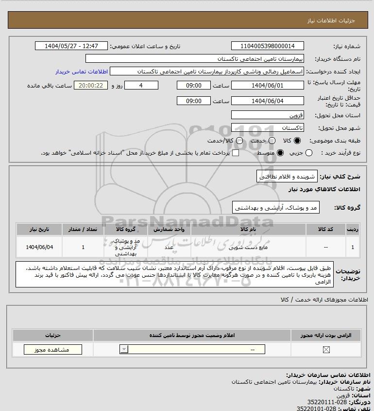 نام دستگاه خریدار:بیمارستان تامین اجتماعی تاکستان