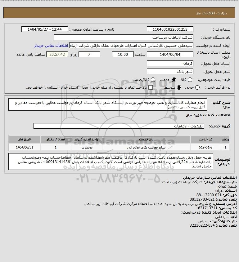 شرح کلی نیاز: انجام عملیات کانالسازی و نصب حوضچه فیبر نوری در ایستگاه شهر بابک استان کرمان(درخواست مطابق با فهرست مقادیر و فایل پیوست می باشد )