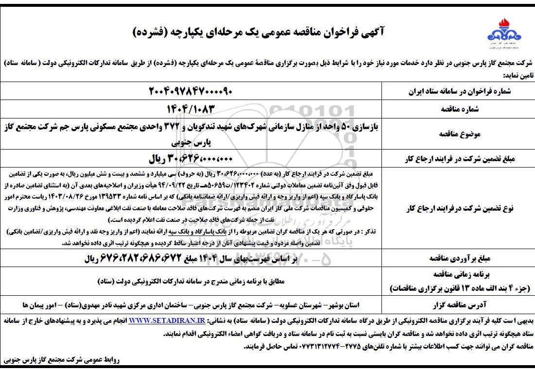 موضوع مناقصه: بازسازی 50 واحد از منازل سازمانی شهرکهای شهید تندگویان و 372 واحد مجتمع مسکونی پارس جم شرکت مجتمع گاز پارس جنوبی