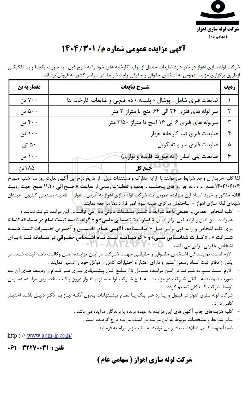 شرکت لوله سازی اهواز در نظر دارد ضایعات حاصل از تولید کارخانه های خود را به شرح ذیل ، به صورت یکجا و یا تفکیکی ازطریق برگزاری مزایده عمومی به اشخاص حقوقی و حقیقی واجد شرایط در سراسر کشور به فروش برساند :