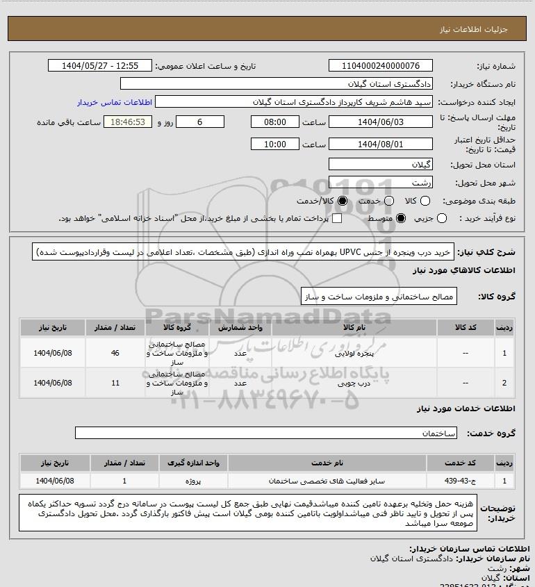 شرح کلی نیاز: خرید درب وپنجره از جنس UPVC بهمراه نصب وراه اندازی (طبق مشخصات ،تعداد اعلامی در لیست وقراردادپیوست شده)