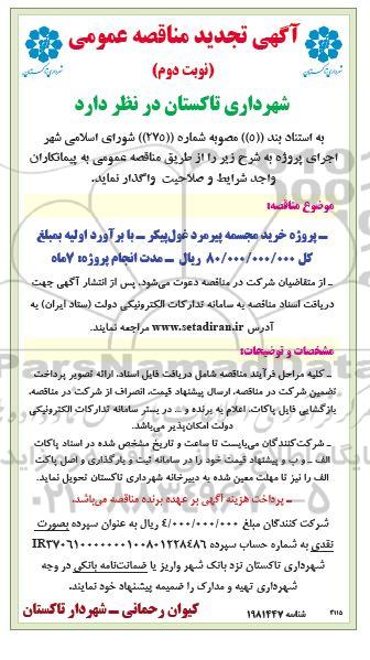 شهرداری تاکستان در نظر دارد به استناد بند (5) مصوبه شماره (275) شورای اسلامی شهر اجرای پروژه به شرح زیر را از طریق مناقصه عمومی به پیمانکاران واجد شرایط و صلاحیت واگذار نماید .