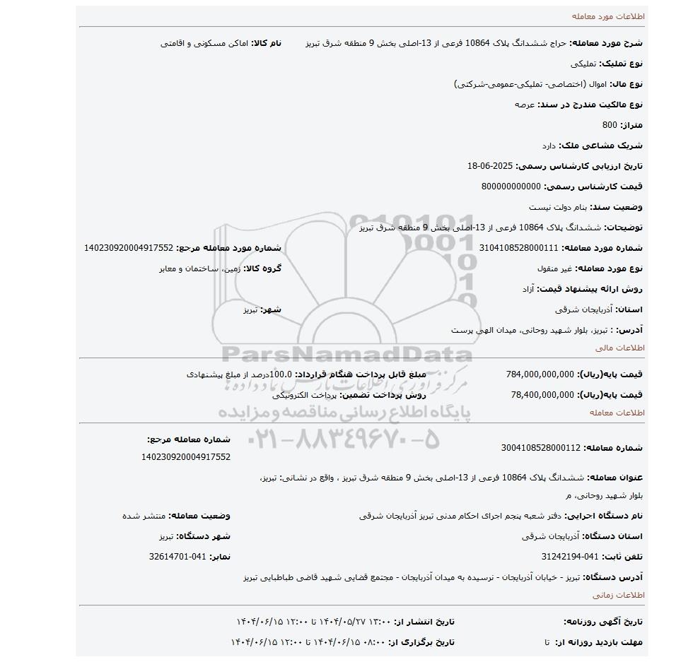| شرح مورد معامله: حراج ششدانگ پلاک 10864 فرعی از 13-اصلی بخش 9 منطقه شرق تبریز | نام کالا: اماکن مسکونی و اقامتی | |