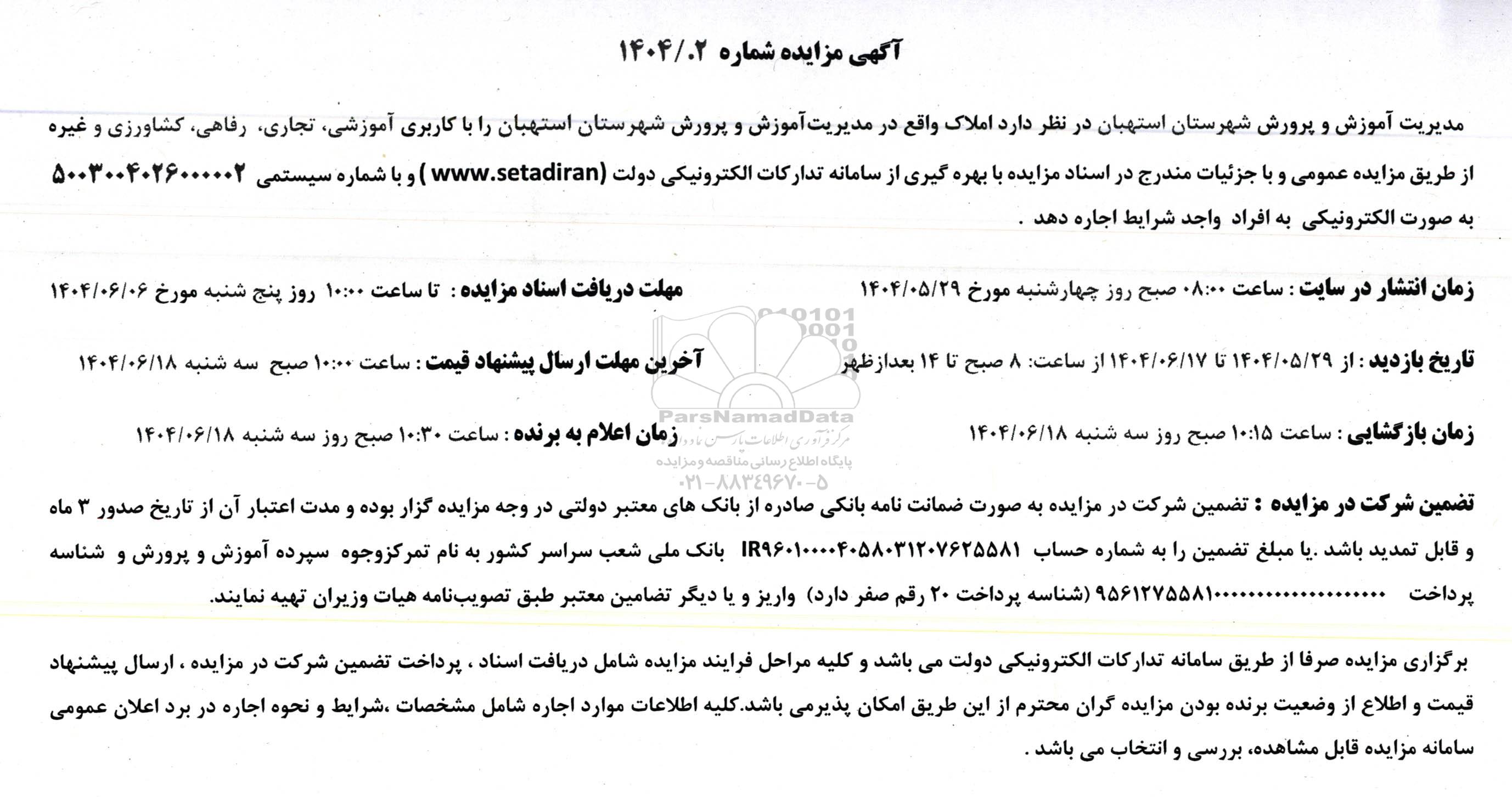 مدیریت آموزش و پرورش شهرستان استهبان در نظر دارد املاک واقع در مدیریت آموزش و پرورش شهرستان استهبان را با کاربری آموزشی، تجاری، رفاهی، کشاورزی و غیره از طریق مزایده عمومی و با جزئیات مندرج در اسناد مزایده با بهره گیری از سامانه تدارکات الکترونیکی دولت (ستاد ایران ) و با شماره سیستمی 5003004026000002 به صورت الکترونیکی به افراد واجد شرایط اجاره دهد