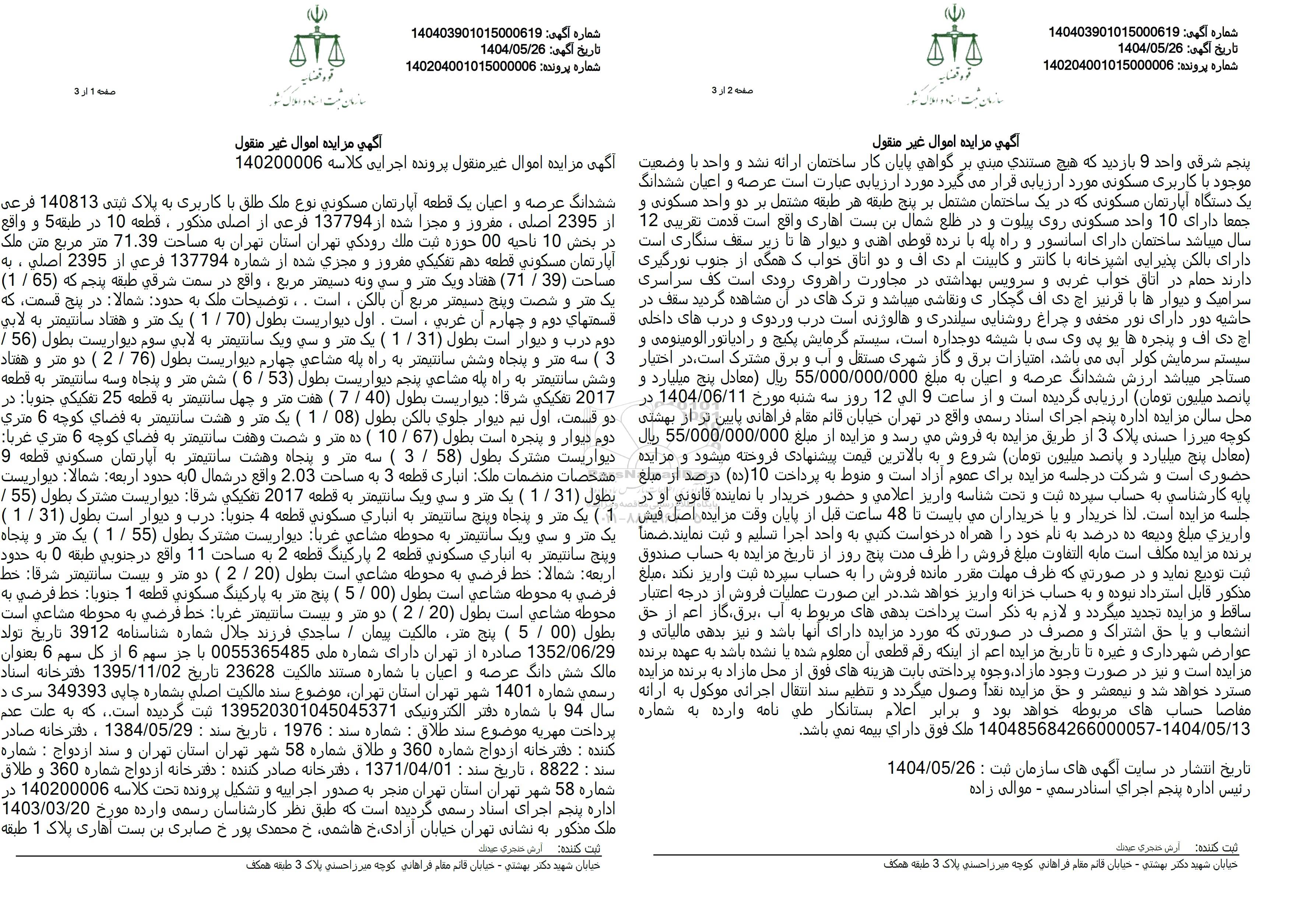 مزایده فروش یک قطعه آپارتمان مسکونی به مساحت 71.39 مترمربع با پلاک ثبتی 140813 فرعی از 2395 اصلی, مزایده فروش یک قطعه زمین با پلاک ثبتی 1630 فرعی از 1249 اصلی