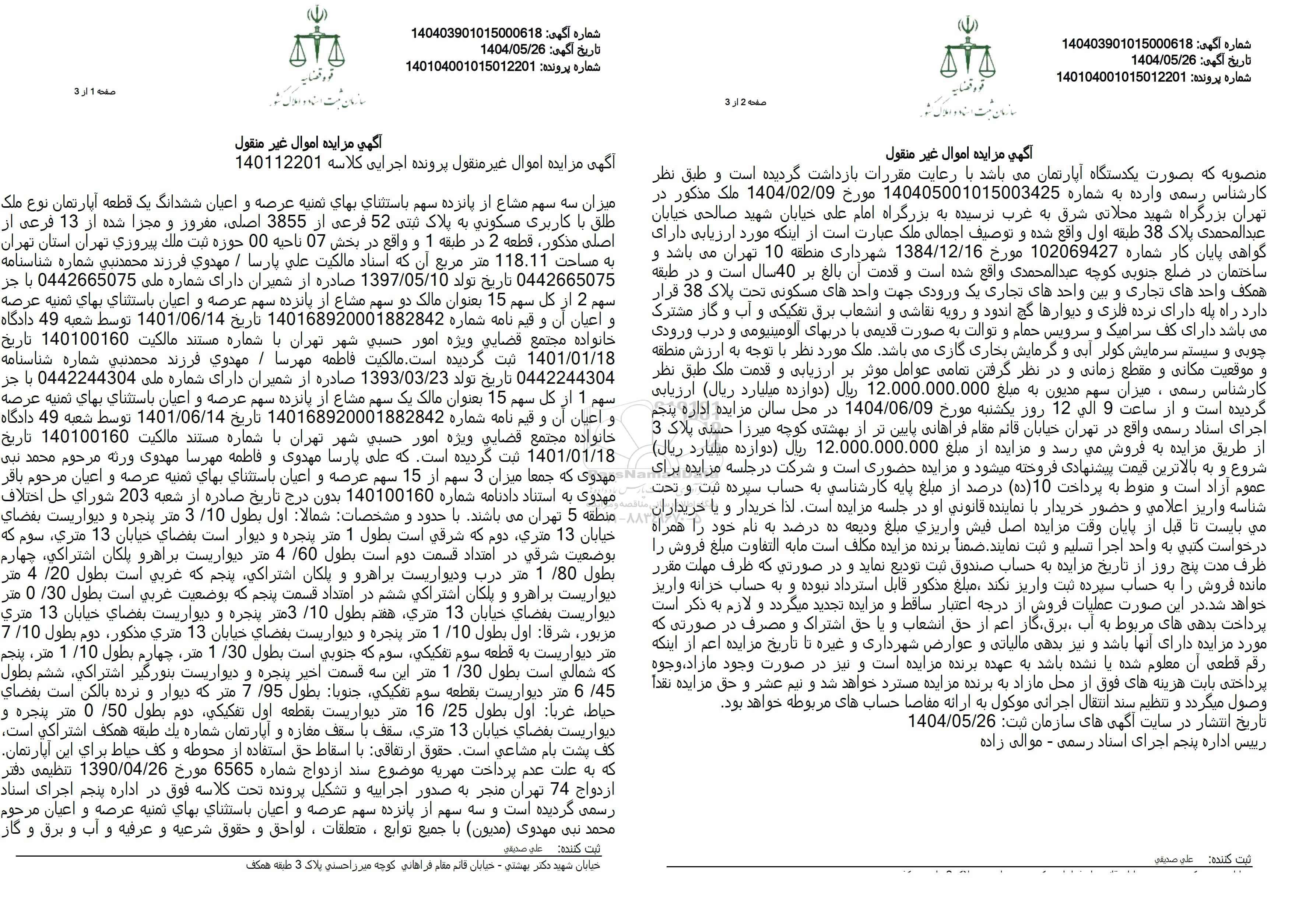 مزایده فروش یک قطعه آپارتمان مسکونی با پلاک ثبتی 52 فرعی از 3855 اصلی, مزایده فروش یک قطعه آپارتمان مسکونی با پلاک ثبتی 52 فرعی از 3855 اصلی