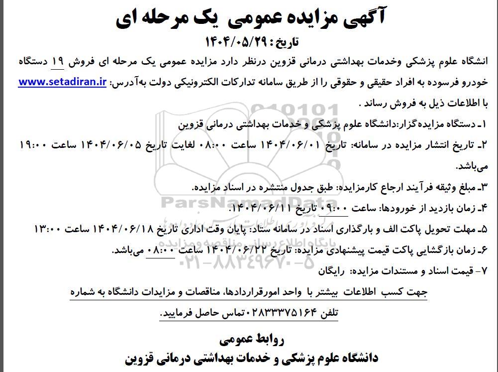 دانشگاه علوم پزشکی و خدمات بهداشتی درمانی قزوین در نظر دارد مزایده عمومی یک مرحله ای فروش 19 دستگاه خودرو فرسوده به افراد حقیقی و حقوقی را از طریق سامانه تدارکات الکترونیکی دولت به آدرس ستاد ایران با اطلاعات ذیل به فروش رساند .