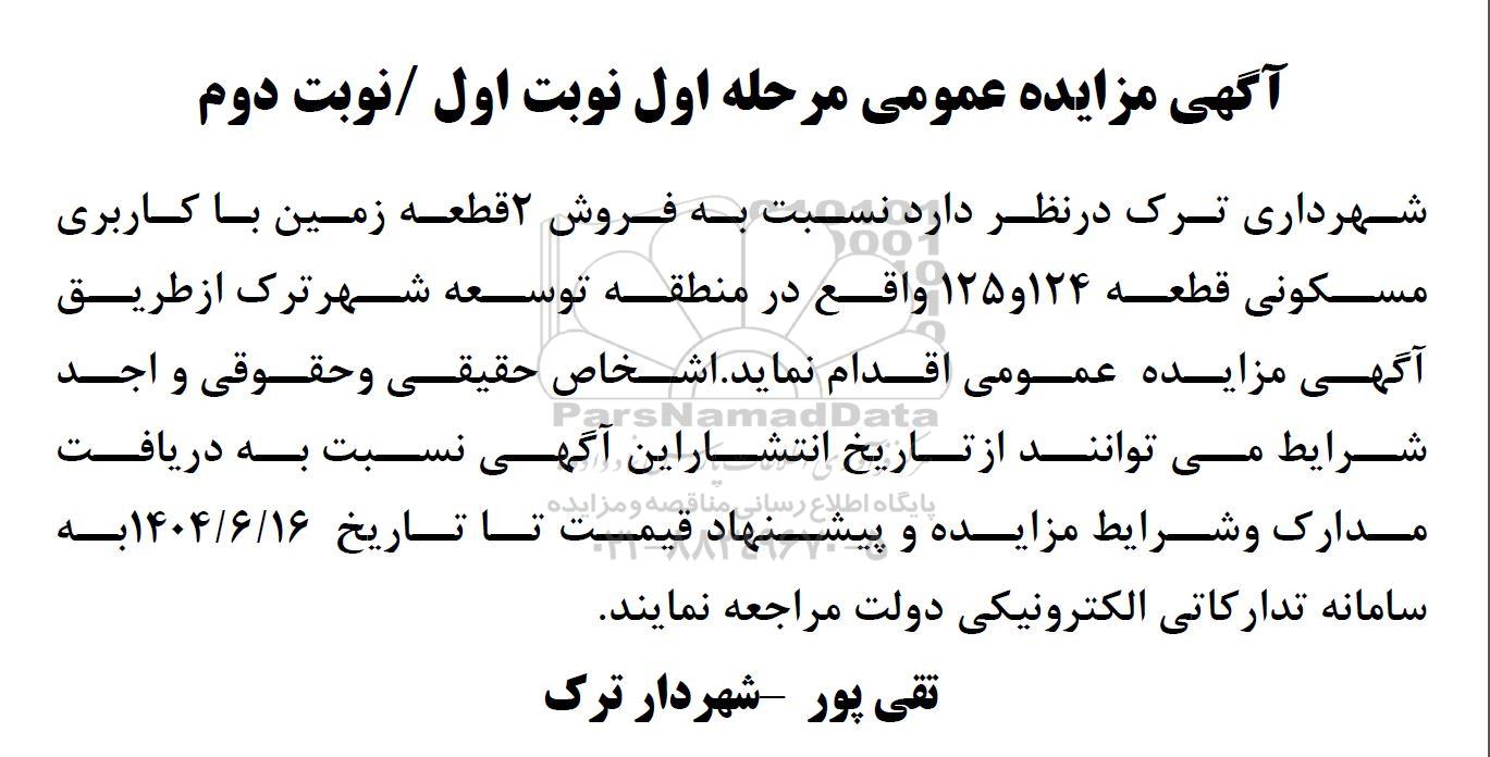 شهرداری ترک در نظر دارد نسبت به فروش 2 قطعه زمین با کاربری مسکونی قطعه 124 و 125 واقع در منطقه توسعه شهر ترک از طریق آگهی مزایده عمومی اقدام نماید. اشخاص حقیقی و حقوقی واجد شرایط می توانند از تاریخ انتشار این آگهی نسبت به دریافت مدارک و شرایط مزایده و پیشنهاد قیمت تا تاریخ 1404.6.16 به سامانه تدارکاتی الکترونیکی دولت مراجعه نمایند.