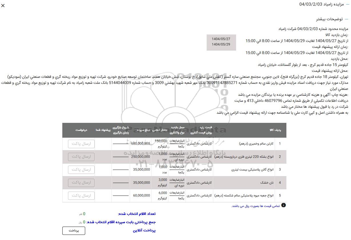 5 مزایده عمومی فروش اقلام ضایعاتی و مازاد از قبیل ضایعات حلب روغن و پنیر و عسل ... 9646216 1404/07/13 new special not payed تهران