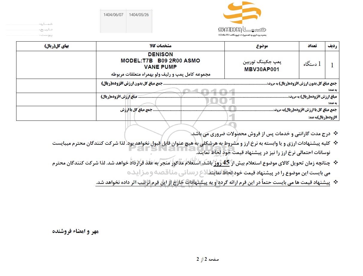 استعلام بها و موضوع استعلام استعلام پمپ جکینگ ژنراتور MBV30AP001 به اطلاع کلیه شرکتها و افراد متخصص واجد شرایط میرساند، آگهی گذار در نظر دارد از طریق استعلام بها، نسبت به انتخاب و دریافت پیشنهادات اقدام نماید. این استعلام با کد آگهی ثبت شده در سامانه خبرگزاری پارس نماد : 9425633 منتشر شده است. مشخصات استعلام : تاریخ شروع استعلام: 1404/05/26 آخرین مهلت ارسال پیشنهاد قیمت : 1404/06/07 و محل اجرای پروژه : استان سایر میباشد. استعلام قیمت مورد درخواست : استعلام پمپ جکینگ ژنراتور MBV30AP001 با دستهبندیهای تخصصی و گروه های مرتبط : الکتروموتور و پمپ های شناور, دیزل ژنراتور, نیروگاه, تجهیزات برق و الکترونیک, استعلام اطلاع رسانی میگردد. شرایط شرکت در استعلام آنلاین : ابتدا ثبت نام در سامانه استعلام پارس نماد و تکمیل مدارک موردنیاز و بارگذاری در سامانه رعایت تمامی ضوابط و الزامات مندرج در اسناد استعلام است.