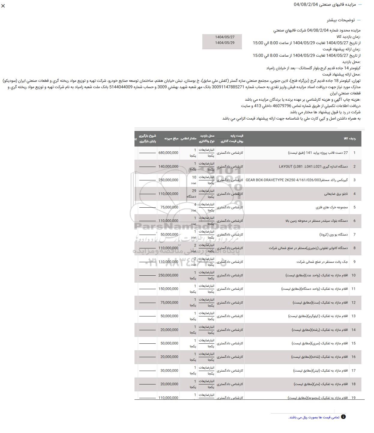 قطعات صنعتی ایران هزینه چاپ آگهی و هزینه کارشناسی بر عهده برنده یا برندگان مزایده می باشد.