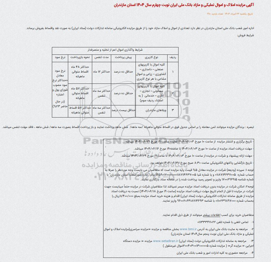 آگهی مزایده املاک و اموال تملیکی و مازاد بانک ملی ایران نوبت چهارم سال 1404 استان مازندران ؟