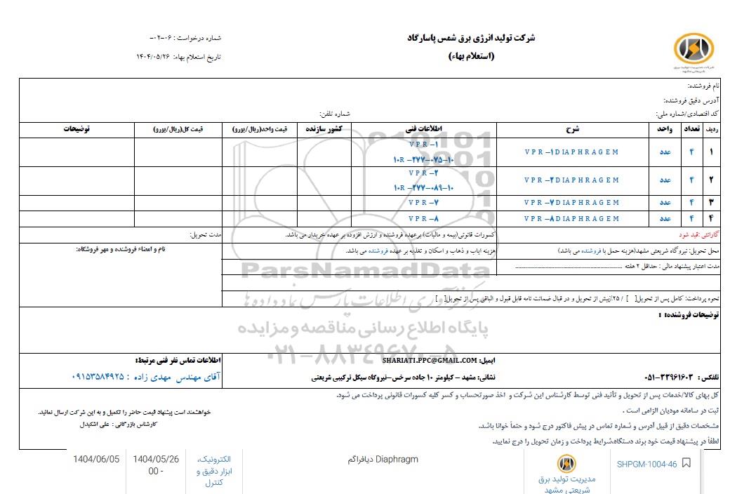 استعلام بها و موضوع استعلام استعلام دیافراگم DIAPHRAGM به اطلاع کلیه شرکت‌ها و افراد متخصص واجد شرایط می‌رساند، آگهی گذار در نظر دارد از طریق استعلام بها، نسبت به انتخاب و دریافت پیشنهادات اقدام نماید. این استعلام با کد آگهی ثبت شده در سامانه خبرگزاری پارس نماد : 9425675 منتشر شده است. مشخصات استعلام : تاریخ شروع استعلام: 1404/05/27 آخرین مهلت ارسال پیشنهاد قیمت : 1404/06/05 و محل اجرای پروژه : استان خراسان رضوی میباشد. استعلام قیمت مورد درخواست : استعلام دیافراگم DIAPHRAGM با دسته‌بندی‌های تخصصی و گروه های مرتبط : قطعات لاستیکی, نیروگاه, تجهیزات برق و الکترونیک, استعلام اطلاع رسانی میگردد. شرایط شرکت در استعلام آنلاین : ابتدا ثبت نام در سامانه استعلام پارس نماد و تکمیل مدارک موردنیاز و بارگذاری در سامانه رعایت تمامی ضوابط و الزامات مندرج در اسناد استعلام است.