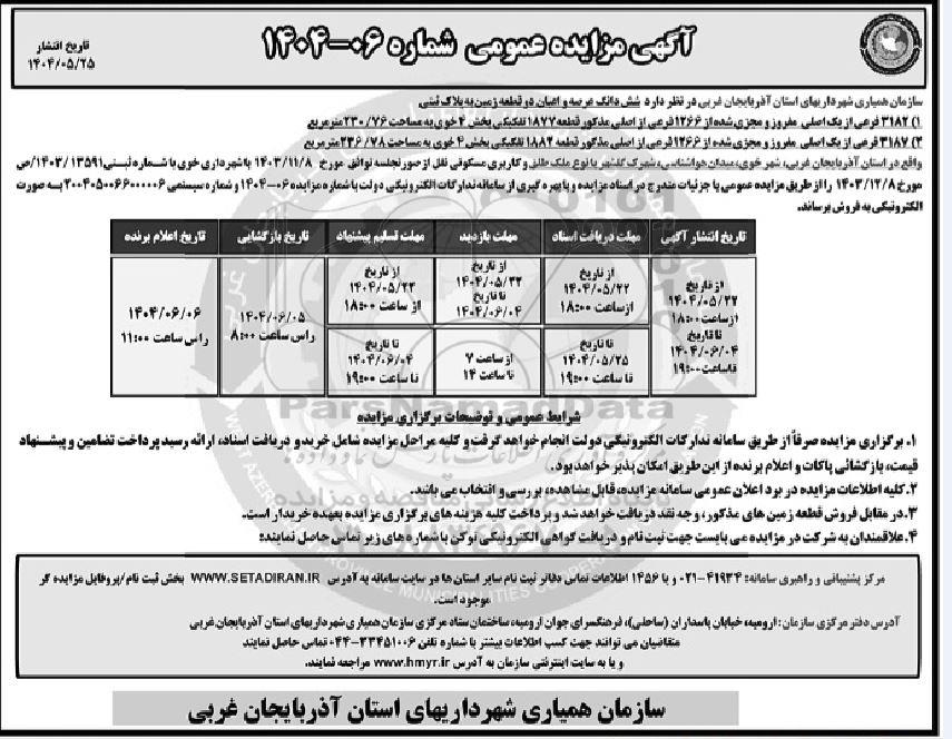 مزایده عمومی مزایده ششدانگ عرصه و اعیان دو قطعه زمین برگزار میگردد. از کلیه افراد متخصص و شرکت‌های واجد شرایط دعوت به عمل می‌آید تا در این مزایده با کد خبرگزاری پارس نماد : 9425687 شرکت نمایند تاریخ شروع مزایده : 1404/05/27 مهلت شرکت در مزایده: تا پایان روز 1404/06/04 مکان برگزاری اموال واگذاری استان‌های آذربایجان غربی و دسته‌بندی‌های مربوط به این حراجی املاک و زمین میباشد. اطلاعات دقیق‌تر درباره شرایط شرکت در مزایده آنلاین و نحوه ارسال مدارک، الزامات پروژه و دریافت اسناد مزایده و تاریخ بازگشایی پاکت‌ها، در بخش اطلاعات تکمیلی این آگهی درج شده است.