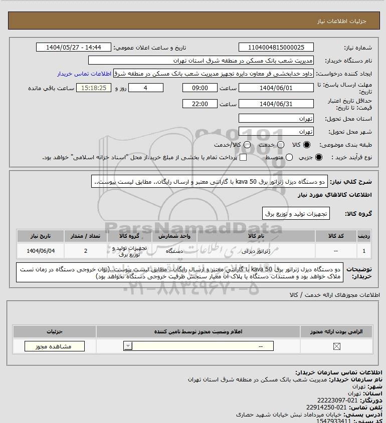 استعلام دو دستگاه دیزل ژنراتور برق 50 kava با گارانتی معتبر و ارسال رایگان.. مطابق لیست پیوست.., استعلام دو دستگاه دیزل ژنراتور برق 50 kava با گارانتی معتبر و ارسال رایگان.. مطابق لیست پیوست..