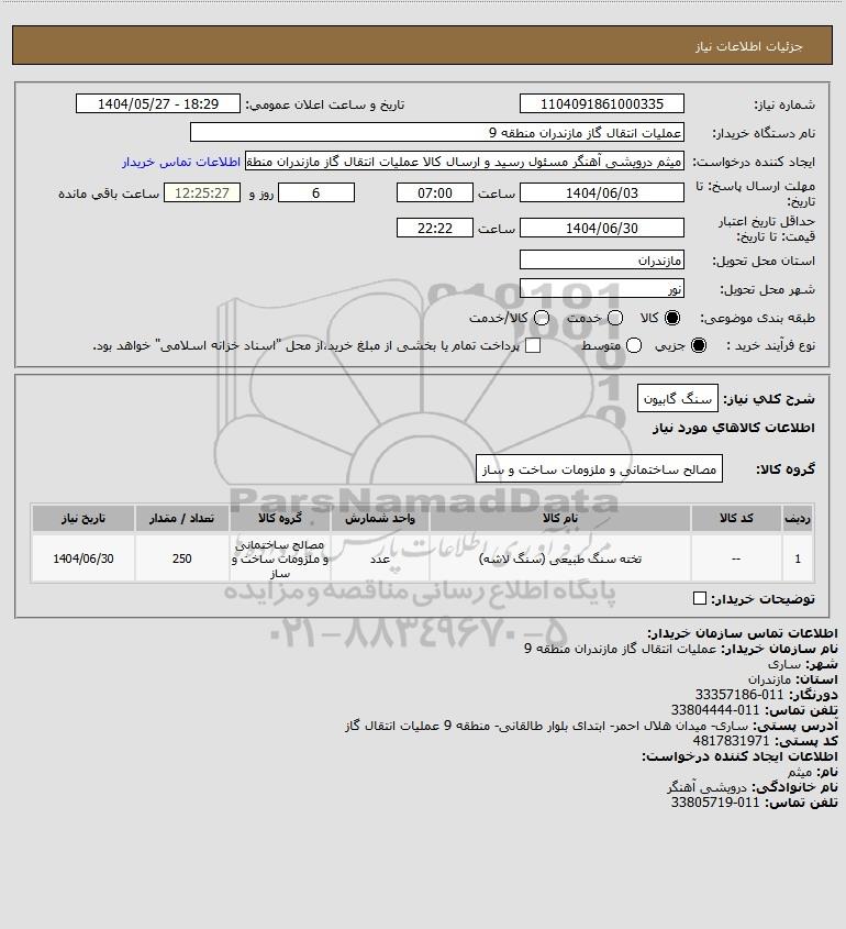 | 1 | -- | تخته سنگ طبیعی (سنگ لاشه) | عدد | مصالح ساختمانی و ملزومات ساخت و ساز | 250 | 1404/06/30 |