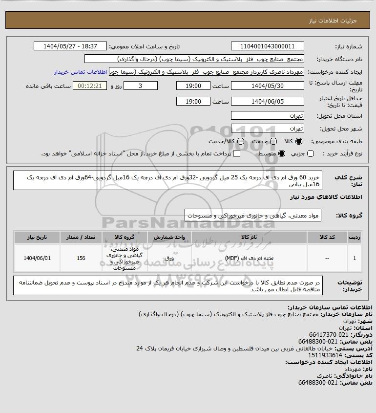 | 1 | -- | تخته ام دی اف (MDF) | ورق | مواد معدنی، گیاهی و جانوری غیرخوراکی و منسوجات | 156 | 1404/06/01 |
