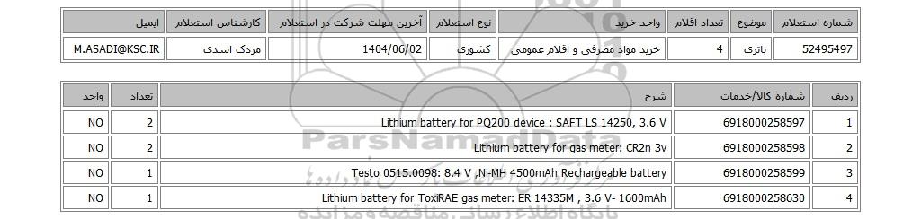 52495497باتری4خرید مواد مصرفی و اقلام عمومیکشوری1404/06/02مزدک اسدیM.ASADI@KSC.IR