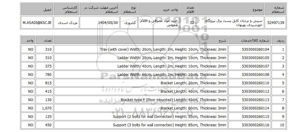 | 52497139 | سینی و نردبان کابل پست برق نیروگاه خورشیدی بهبهان | 32 | خرید مواد مصرفی و اقلام عمومی | کشوری | 1404/05/30 | مزدک اسدی | M.ASADI@KSC.IR |