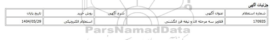 | 170935 | قلاویز سه مرحله ای و تیغه فرز انگشتی | استعلام الکترونیکی | 1404/05/29 |