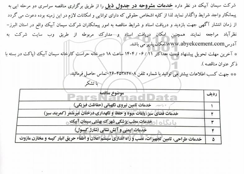 شرکت سیمان آبیک در نظر دارد خدمات مشروحه در جدول ذیل را از طریق برگزاری مناقصه سراسری دو مرحله ایی به پیمانکار واجد شرایط واگذار نماید لذا از کلیه اشخاص حقوقی که دارای توانایی و امکانات لازم در این زمینه بوده دعوت می گردد از زمان انتشار آگهی جهت بازدید و دریافت اسناد و شرایط مناقصه به امور پیمانکاران شرکت سیمان آبیک واقع در استان البرز - نظرآباد مراجعه نمایند همچنین امکان دریافت اسناد و مدارک مربوطه از طریق وب سایت شرکت به آدسر www.abyekcement.com امکان پذیر می باشد.