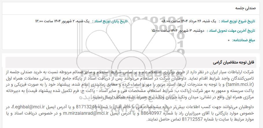 داوطلبان می‌توانند جهت کسب اطلاعات بیش‌تر درباره مشخصات فنی با خانم اقبال با شماره 81713246 و یا آدرس ایمیل f.eghbal@mci.ir، در خصوص موارد بازرگانی با آقای میرزاییان راد با شماره 88640997 و یا آدرس ایمیل m.mirzaianrad@mci.ir و در خصوص دریافت اسناد و یا موارد مرتبط با سایت با شماره 81712557 تماس حاصل نمایند.
