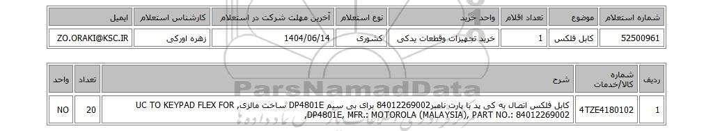 | 52500961 | کابل فلکس | 1 | خرید تجهیزات وقطعات یدکی | کشوری | 1404/06/14 | زهره اورکی | ZO.ORAKI@KSC.IR |