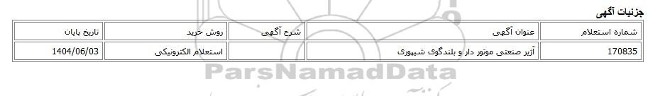| 170835 | آژیر صنعتی موتور دار و بلندگوی شیپوری | استعلام الکترونیکی | 1404/06/03 |
