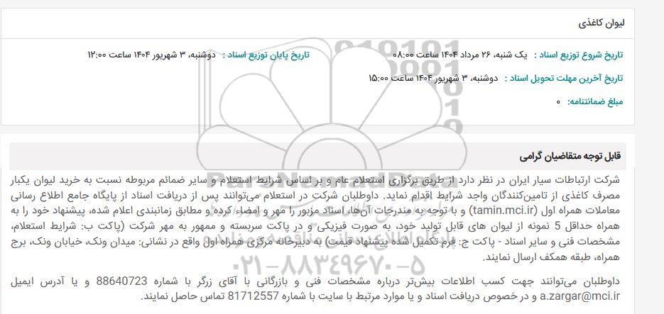 شرکت ارتباطات سیار ایران در نظر دارد از طریق برگزاری استعلام عام و بر اساس شرایط استعلام و سایر ضمائم مربوطه نسبت به خرید لیوان یکبار مصرف کاغذی از تامینکنندگان واجد شرایط اقدام نماید. داوطلبان شرکت در استعلام میتوانند پس از دریافت اسناد از پایگاه جامع اطلاع رسانی معاملات همراه اول (tamin.mci.ir) و با توجه به مندرجات آنها، اسناد مزبور را مهر و امضاء کرده و مطابق زمانبندی اعلام شده، پیشنهاد خود را به همراه حداقل 5 نمونه از لیوان های قابل تولید خود، به صورت فیزیکی و در پاکت سربسته و ممهور به مهر شرکت (پاکت ب: شرایط استعلام، مشخصات فنی و سایر اسناد - پاکت ج: فرم تکمیل شده پیشنهاد قیمت) به دبیرخانه مرکزی همراه اول واقع در نشانی: میدان ونک، خیابان ونک، برج همراه، طبقه همکف ارسال نمایند.