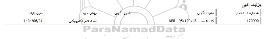 | 170990 | کاسه نمد - NBR - 95x120x13 | استعلام الکترونیکی | 1404/06/01 |