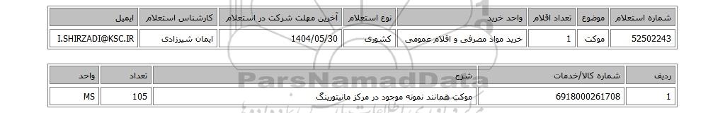 52502243موکت1خرید مواد مصرفی و اقلام عمومیکشوری1404/05/30ایمان شیرزادیI.SHIRZADI@KSC.IR