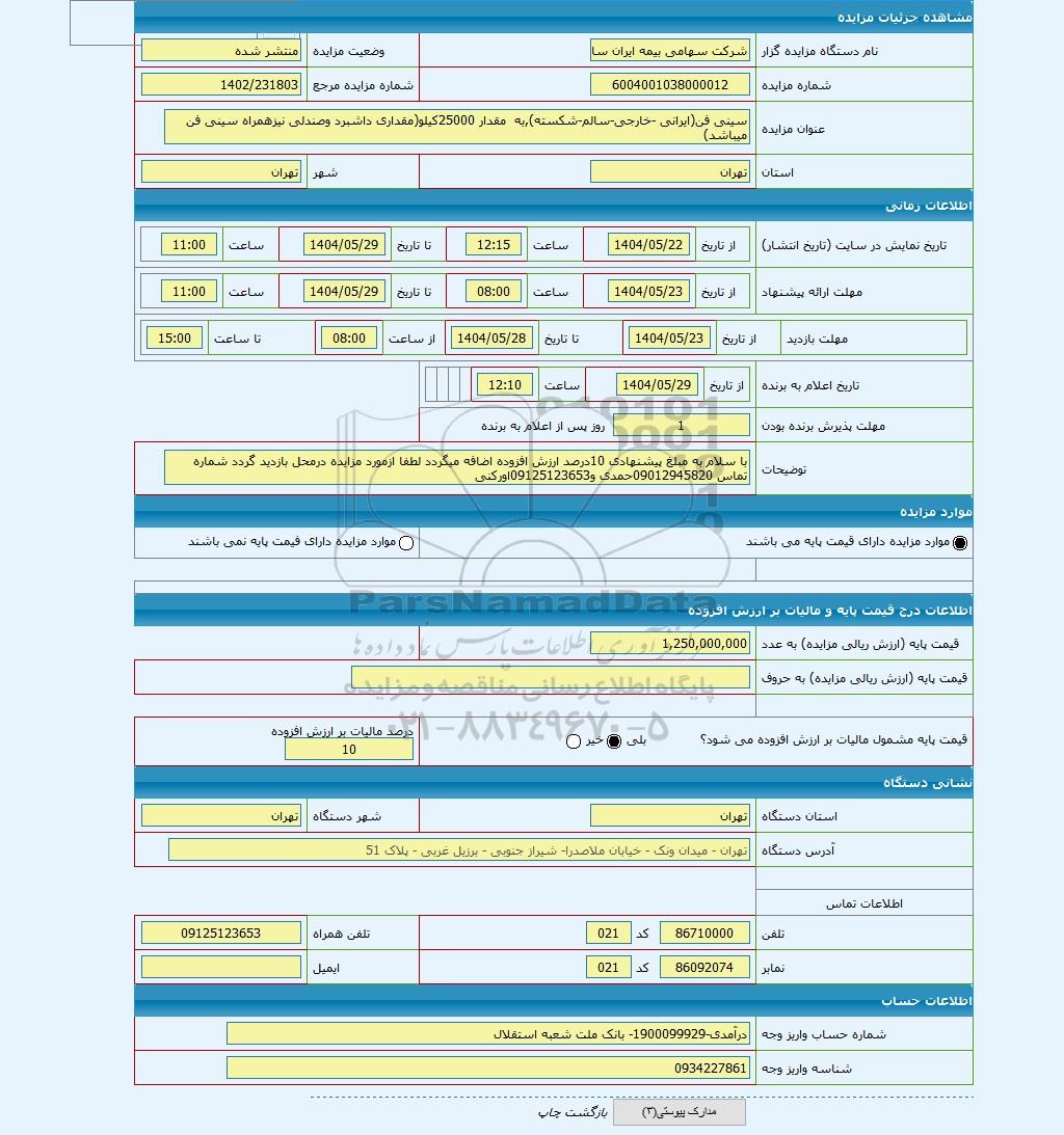 | نام دستگاه مزایده گزار | شرکت سهامی بیمه ایران ساختمان مرکزی | وضعیت مزایده | منتشر شده | |
