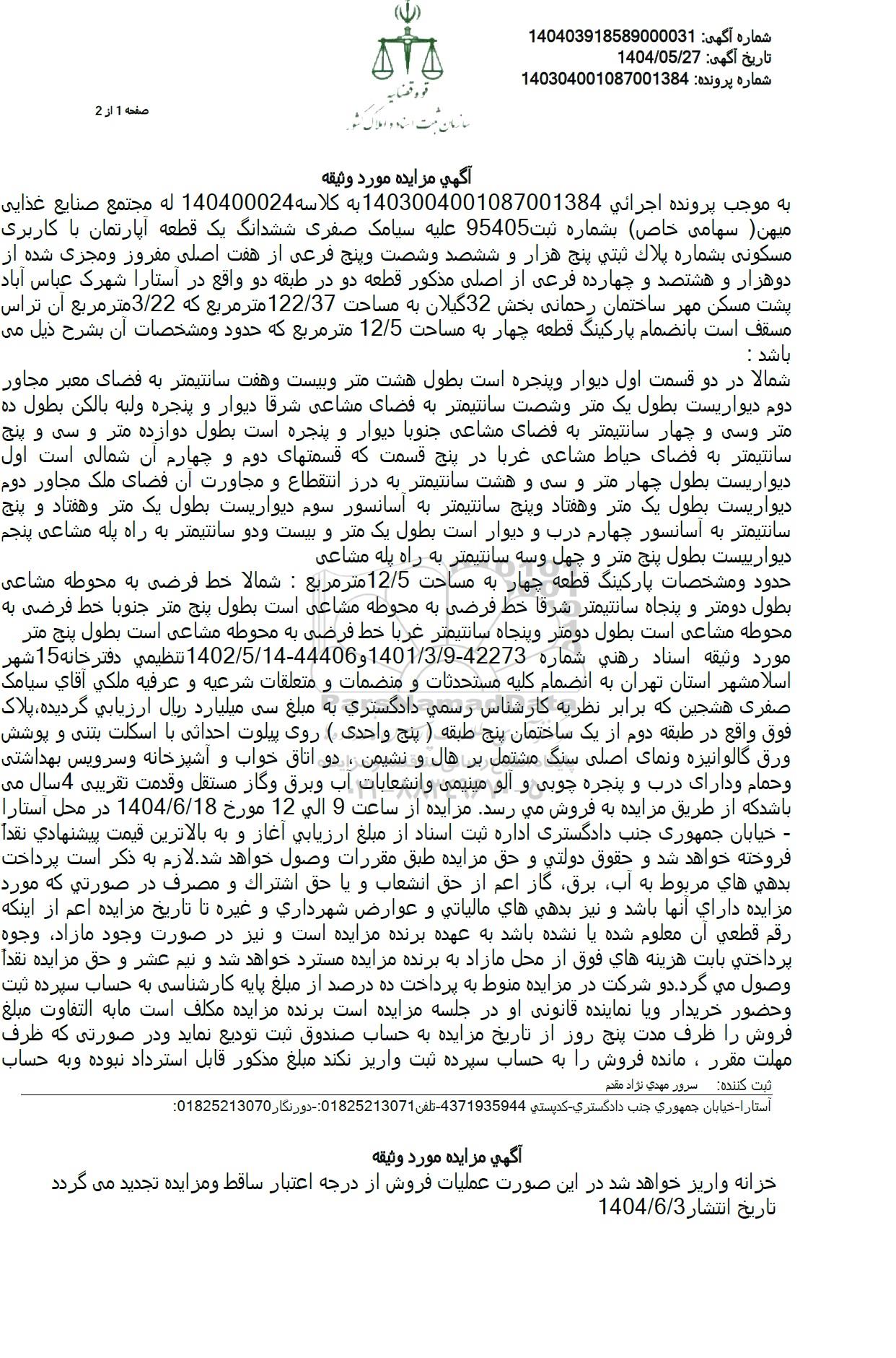 مزایده ششدانگ یک قطعه آپارتمان با کاربری مسکونی بخش 32 کلاسه 140400024