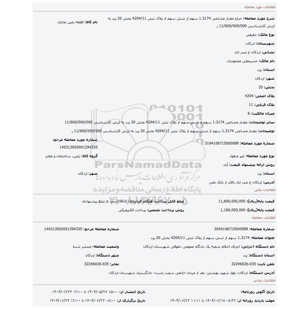 مزایده، مقدار مشاعی  1.3174 سهم از شش سهم از پلاک ثبتی 4204/11  بخش 20 یزد به ارزش کارشناسی 11/600/000/000 ر
