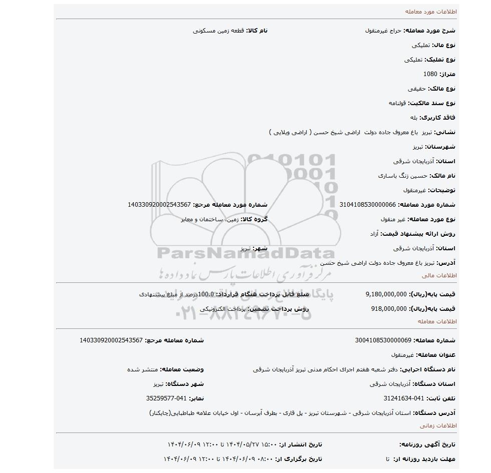 | شرح مورد معامله: حراج غیرمنقول | نام کالا: قطعه زمین مسکونی | |