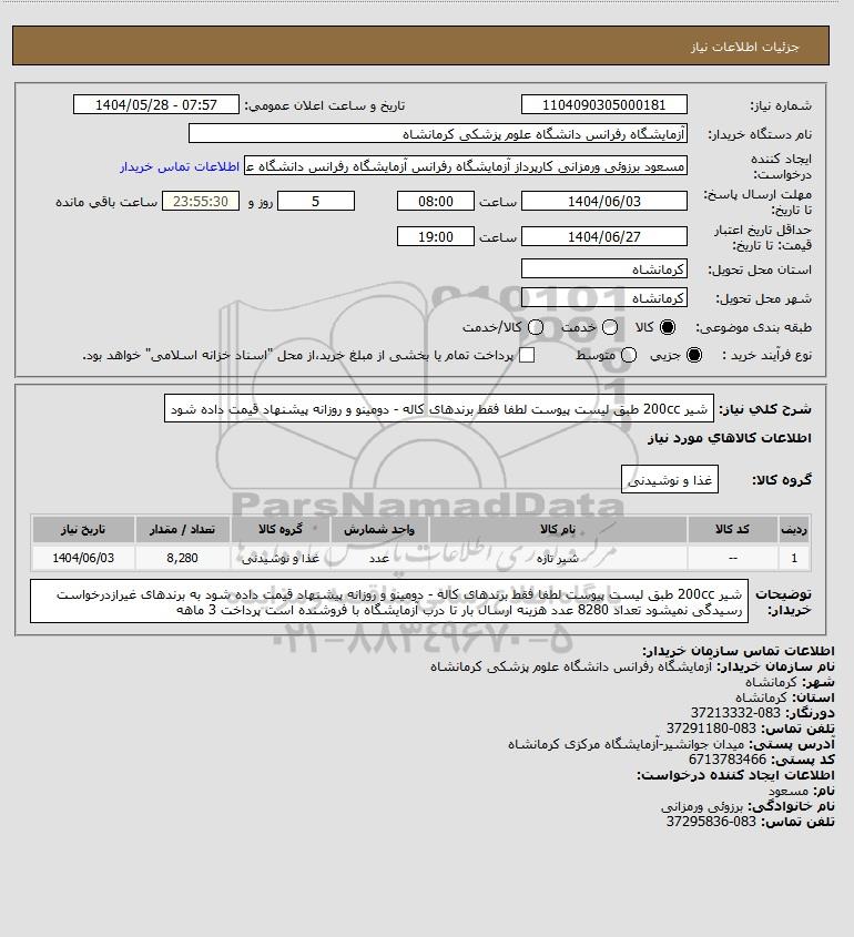 توضیحات خریدار:شیر 200cc طبق لیست پیوست لطفا فقط برندهای کاله - دومینو و روزانه پیشنهاد قیمت داده شود به برندهای غیرازدرخواست رسیدگی نمیشود تعداد 8280 عدد هزینه ارسال بار تا درب آزمایشگاه با فروشنده است پرداخت 3 ماهه